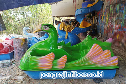 Sepeda bebek air fiberglass model angsa hijau, wahana rekreasi air dengan desain karakter angsa warna hijau cerah dan tampilan menarik.