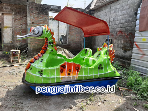Sepeda bebek air fiberglass model kuda laut adalah wahana permainan air berbentuk perahu kecil yang digerakkan dengan cara dikayuh menggunakan pedal, dengan desain unik menyerupai kuda laut pada bagian bodinya. Terbuat dari material fiberglass yang kuat, tebal, ringan, dan tahan karat, wahana ini dirancang untuk memberikan pengalaman rekreasi air yang aman, stabil, dan menyenangkan bagi pengunjung.
